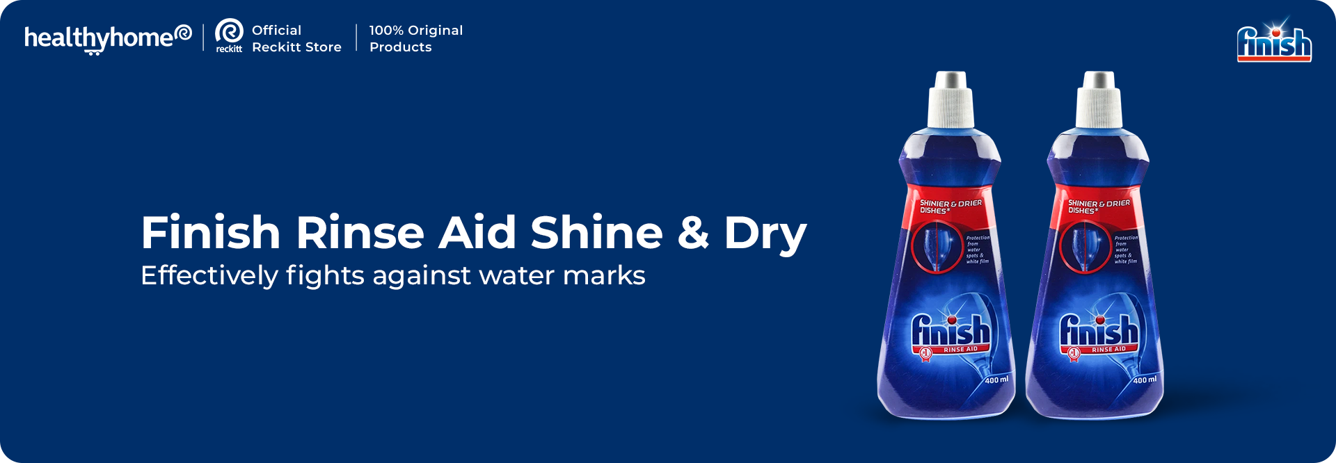 A: Finish Rinse Aid, Shine and dry ensure shiny dishes, assists the drying function and drains off easily from the surface. Finish Rinse Aid, Shine & Dry gives brilliant cleaning with special care for your expensive dishes every time. It works with your detergent to rinse away stubborn leftover food, spots and leaves dishes, glasses and utensils sparkling.