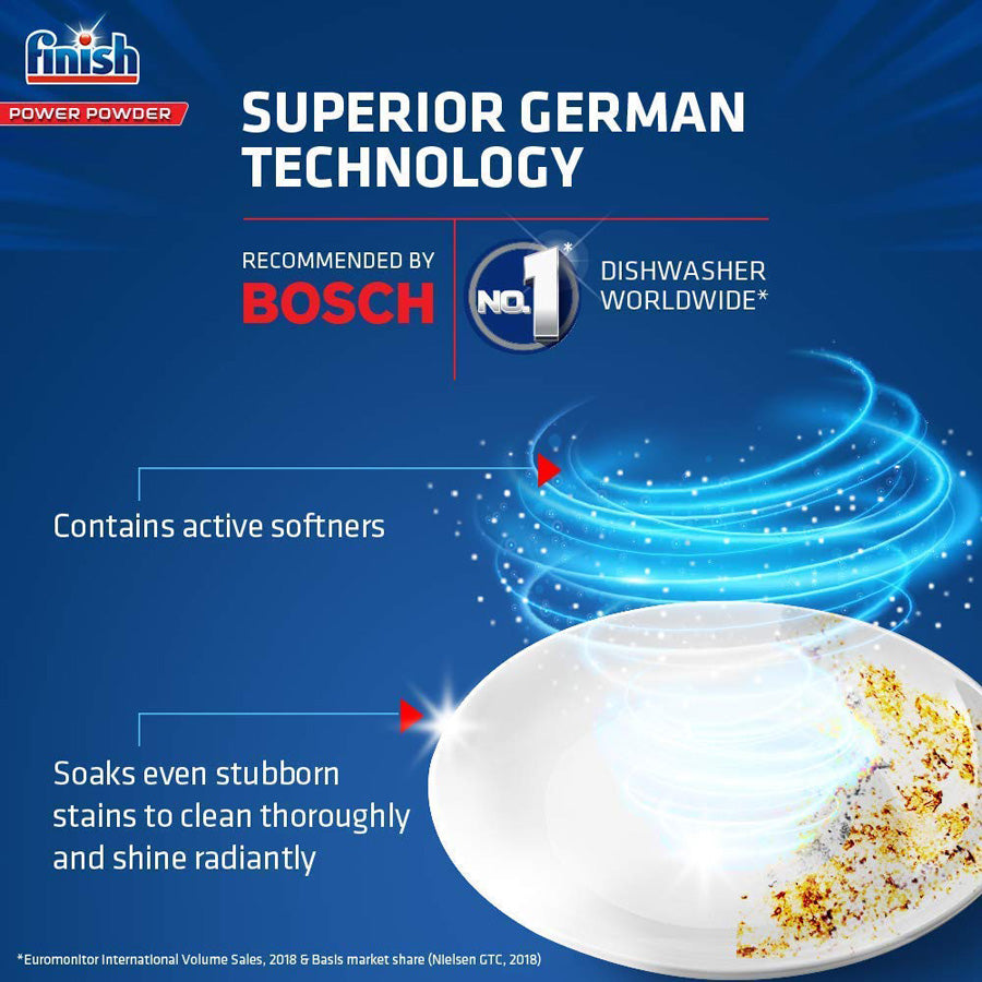 With finish detergent put your dirtiest dishes straight into the dishwasher. Most important additive for any dishwash system. Has active enzymes that help removal of stains from the dishes/utensils. Remove proteins, starch and oil stains.